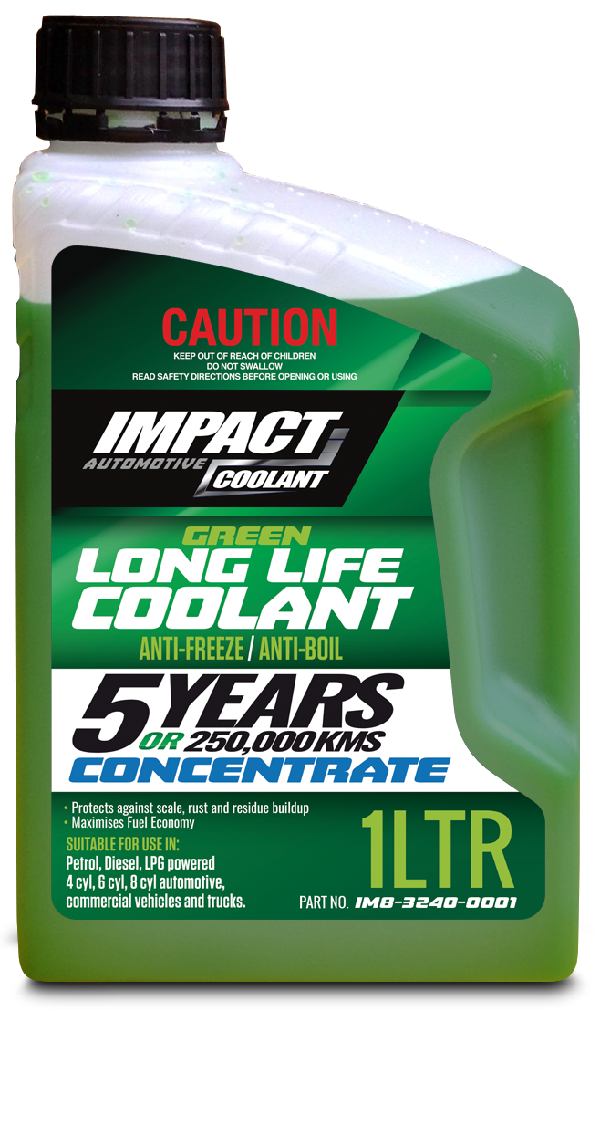 Impact Automotive Green Long Life Coolant is a unique blend of organic long life corrosion inhibitors and ethylene glycol designed to provide superior corrosion protectant and anti-freeze/anti-boil protection for many types of petrol, diesel and gas engines in light commercial and passenger vehicles, heavy duty commercial, industrial, on highway, marine, mining and stationary applications.